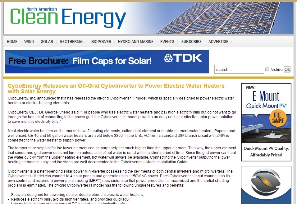 CyboEnergy, Inc. announced that it has released the off-grid CyboInverter H model, which is specially designed to power electric water heaters or electric heating elements. |