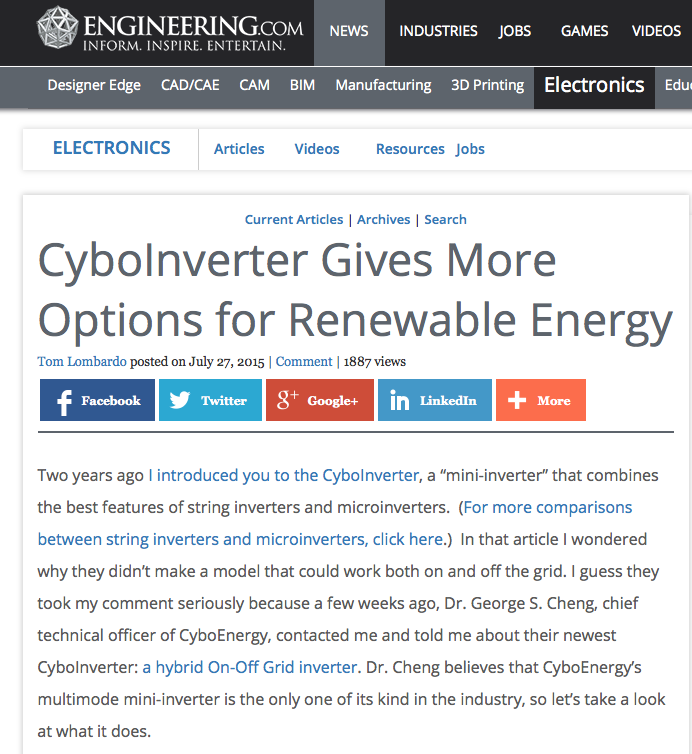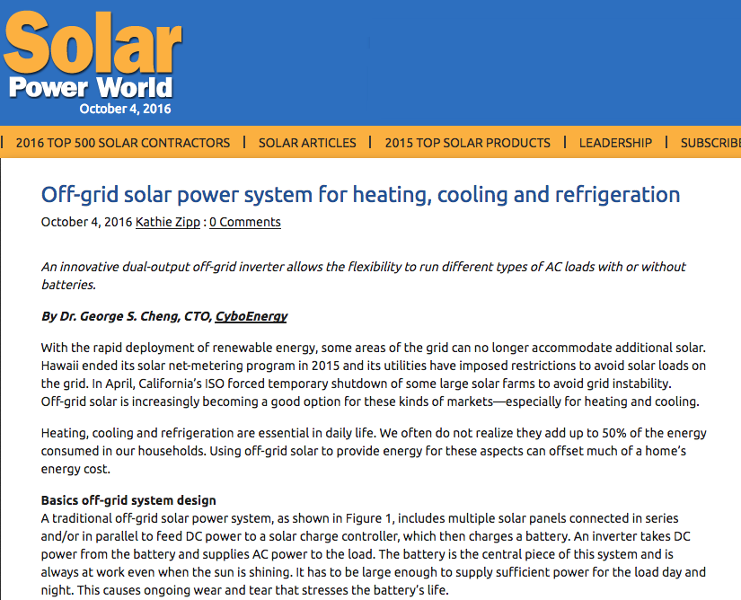 "Two years ago I introduced you to the CyboInverter, a "mini-inverter" that combines the best features of string inverters and microinverters. (For more comparisons between string inverters and microinverters, click here.) In that article I wondered why they didn't make a model that could work both on and off the grid. I guess they took my comment seriously because a few weeks ago, Dr. George S. Cheng, chief technical officer of CyboEnergy, contacted me and told me about their newest CyboInverter: a hybrid On-Off Grid inverter. Dr. Cheng believes that CyboEnergy's multimode mini-inverter is the only one of its kind in the industry, so let's take a look at what it does." |