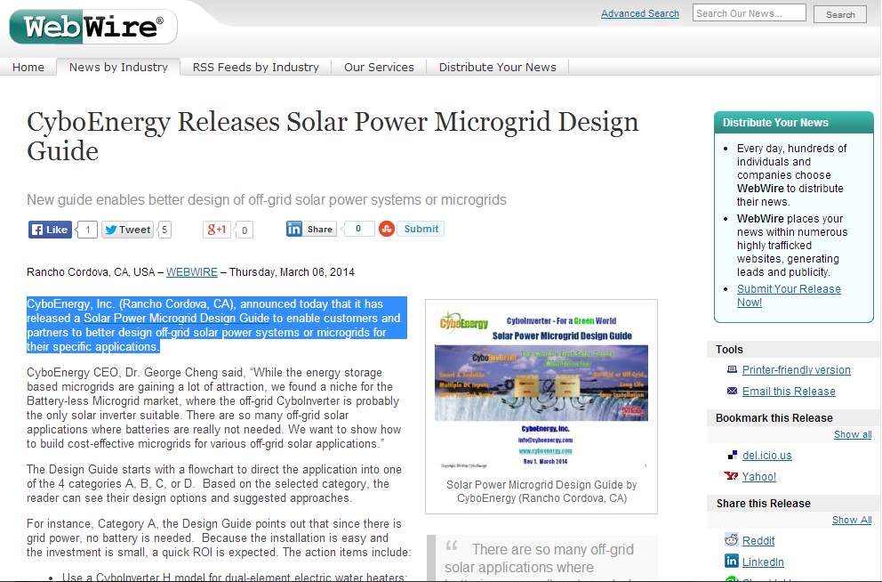 CyboEnergy, Inc. (Rancho Cordova, CA), announced today that it has released a Solar Power Microgrid Design Guide to enable customers and partners to better design off-grid solar power systems or microgrids for their specific applications. |
