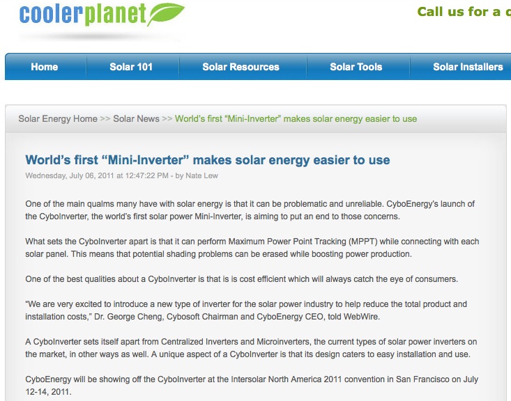 CyboEnergy, a subsidiary of CyboSoft, General Cybernation Group Inc., (Rancho Cordova, California), announced today that it is showing its patent-pending CyboInverter, the world's first solar power Mini-Inverter at Intersolar North America in San Francisco, Calif., on July 12-14, 2011. |
