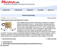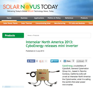 CyboEnergy, a subsidiary of CyboSoft, General Cybernation Group Inc., based in Rancho Cordova, California (US) will unveil at Intersolar North America the CyboInverter, what it is calling the world's first solar power mini-inverter. |