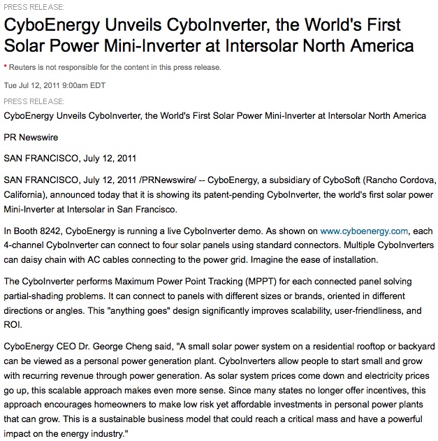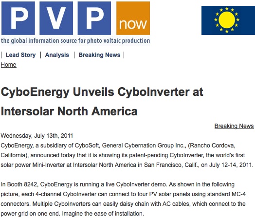 CyboEnergy, a subsidiary of CyboSoft, General Cybernation Group Inc., announced today that it introduced CyboInverter, the world's first solar power Mini-Inverter at the Intersolar exhibition in San Francisco on July 12-14, 2011. |