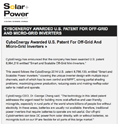 "CyboEnergy has announced that the company has been awarded U.S. patent 8,994,218 entitled "Smart and Scalable Off-Grid Mini-Inverters."