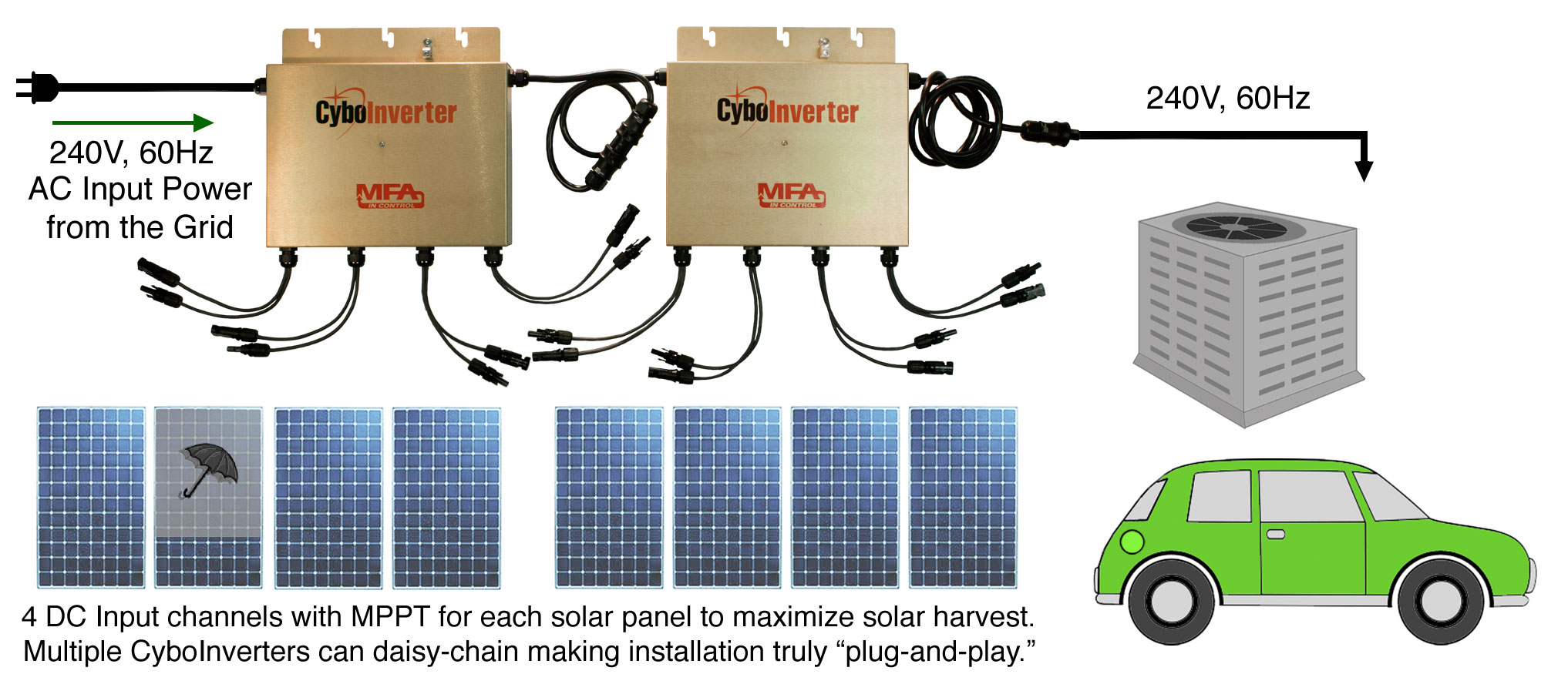 The AC assisted off-grid CyboInverters include the following features and benefits: (1) can run AC loads with solar power only, grid power only, or combined power; (2) require no batteries; (3) have panel level MPPT to maximize solar production; (4) can start heavy loads with assisted AC power and run the loads with only solar power; (5) avoid all the headaches of an on-grid solar system, and (6) are easy to install with great ROI.