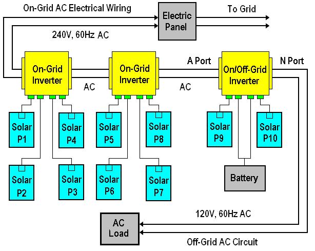 Each CyboInverter (CIM-1200A/N) can connect to four solar or battery DC sources and produce 1250W, 240V, 60Hz AC to the grid when grid is on, or 120V AC to an off-grid circuit to run AC loads.