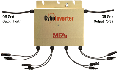 Each CyboInverter (CIM-1200H/N) can connect to four solar panels or a 48V battery, and generate up to 1250W AC to power heating elements via H port or produce 120V AC to run AC loads via N port. |