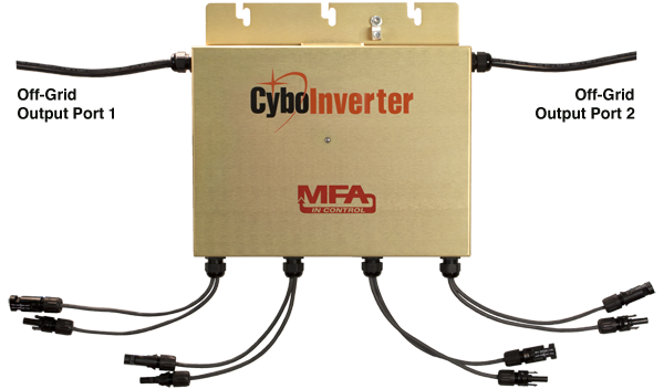 The following graphic shows a 4-channel 1.25KW Dual-Output Off-Grid CyboInverter that has two AC output ports to power different types of loads. Each inverter has four input channels that can connect to four solar panels or batteries and produce 1250W AC peak power. The product is patented, UL1741 certified, NEMA 6 rated, and made in the USA.