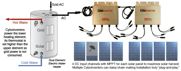 A simple 1.5KW off-grid solar power system includes one CyboInverter H model and four 300W to 550W solar panels. In most areas, it can generate about 8KWh to 12KWh usable solar energy daily for electric water heaters with heating elements ranging from 3KW to 5KW. It can provide sufficient hot water for a 2 to 3 people family. Depending on the installation site and local electricity rates, return-on-investment (ROI) can be achieved in 2 to 4 years.