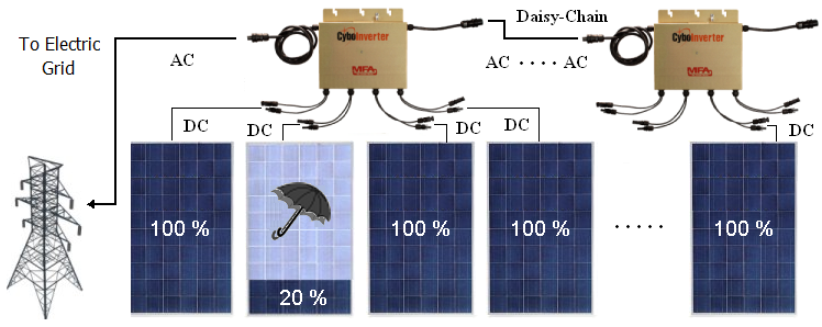 4. A number of CyboInverters can easily daisy chain with standard AC power cables and connectors. The total generated power equals to the summation of the AC power supplied by each CyboInverter.