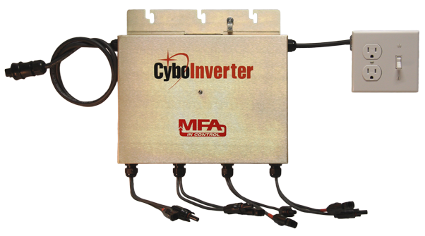 The following graphic shows a 4-channel 1.2KW On/Off-Grid CyboInverter that has an on-grid AC output port and an off-grid AC output port. Each inverter has four input channels that can connect to four 300W DC sources including solar panels, wind generators, hydro-generators, or batteries and produce 1250W AC peak power. Each input channel has its own control and MPPT to eliminate solar partial shading problems and maximize power production. The product is patented, UL1741 certified, and made in the USA.