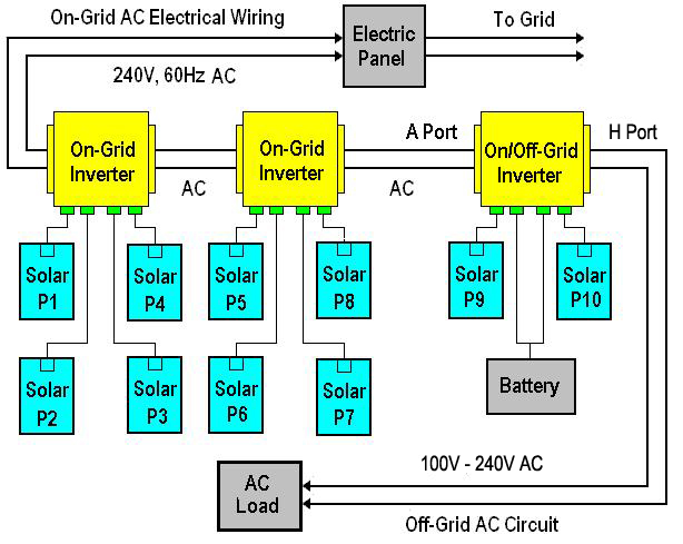 The On/Off-Grid CyboInverters are very useful in areas where the electric grid is unstable or bad weather can take the grid down for days. They can be switched to off-grid mode automatically when the grid is down to run critical loads such as a TV, computer, refrigerator, and phone chargers. The following diagram shows an on/off-grid solar system implemented with an On/Off-Grid CyboInverter A/H model twin pack for sending power to the grid in the on-grid mode or sending power to a water heating in the off-grid mode.