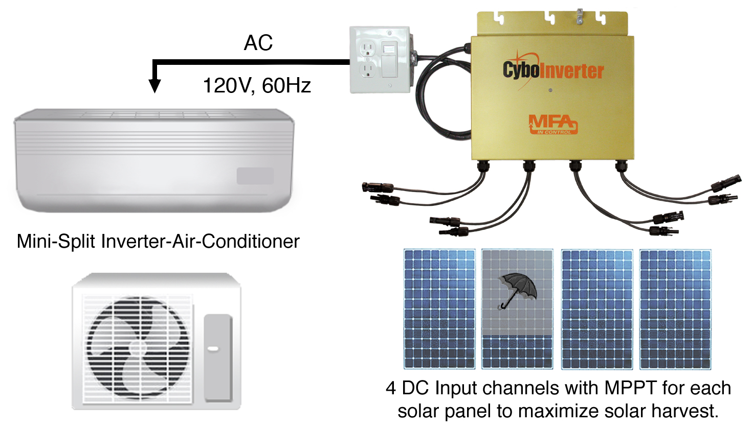 CyboEnergy offers 10 off-grid CyboInverters based on specific electrical standards to serve the global market. Most off-grid solar inverters have to take input power from batteries making the system more complex and less efficient. Off-grid CyboInverters offer a flexible, scalable, cost-effective, battery-less, or battery-enabled off-grid solar solution to meet the needs of a broad range of users, especially those living without access to grid power. The Off-Grid CyboInverter can run an IAC (Inverter-Air-Conditioner) Mini-Split or Window IAC with or without batteries.