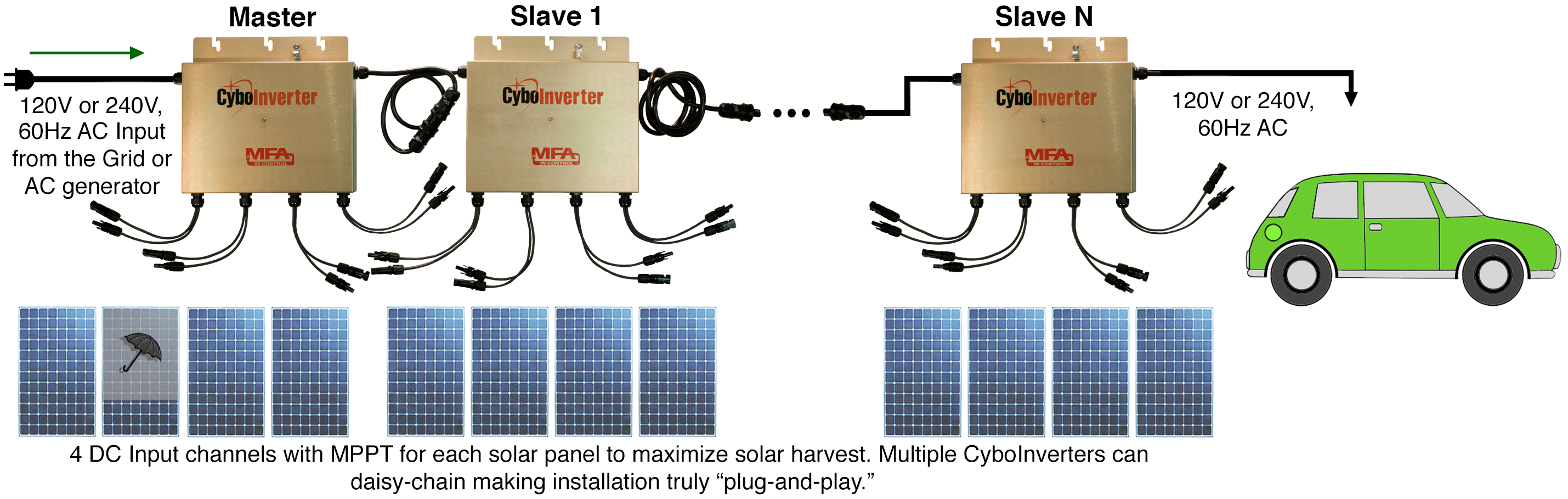 CyboEnergy is offering a patented battery-less off-grid solar EV charging solution as illustrated in the above diagram. The system includes one AC assisted off-grid master inverter on the left and one or multiple slave inverters, all daisy-chained or connected via an AC bus. The electric grid or an AC generator can provide needed AC power to the system through the AC input port of the master inverter. This way, the off-grid solar system can provide EV charging 24/7 in solar only mode, AC input power mode, or combined power mode. For example, one master inverter and three slave inverters with 16 solar panels can provide up to 5KW AC power for EV charging.