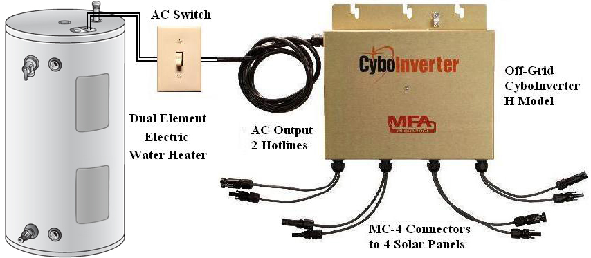 Most electric water heaters on the market have 2 heating elements, called dual-element or double-element water heaters. Popular and well priced, GE 40 and 50 gallon water heaters are sold below $300. In the U.S., AC from a standard 30A branch circuit with 240V is connected to the water heater to supply power. The following picture illustrates that an off-grid CyboInverter is connected to deliver solar energy to the lower heating element. The temperature setpoint for the lower element can be purposely set much higher than the upper element. This way, the upper element that consumes grid power does not turn on unless a lot of hot water is used within a short period of time. Since the grid power can heat the water quickly from the upper heating element, hot water will always be available. Connecting the CyboInverter output to the lower heating element is easy and the steps are well documented in the CyboInverter H Model Installation Guide.