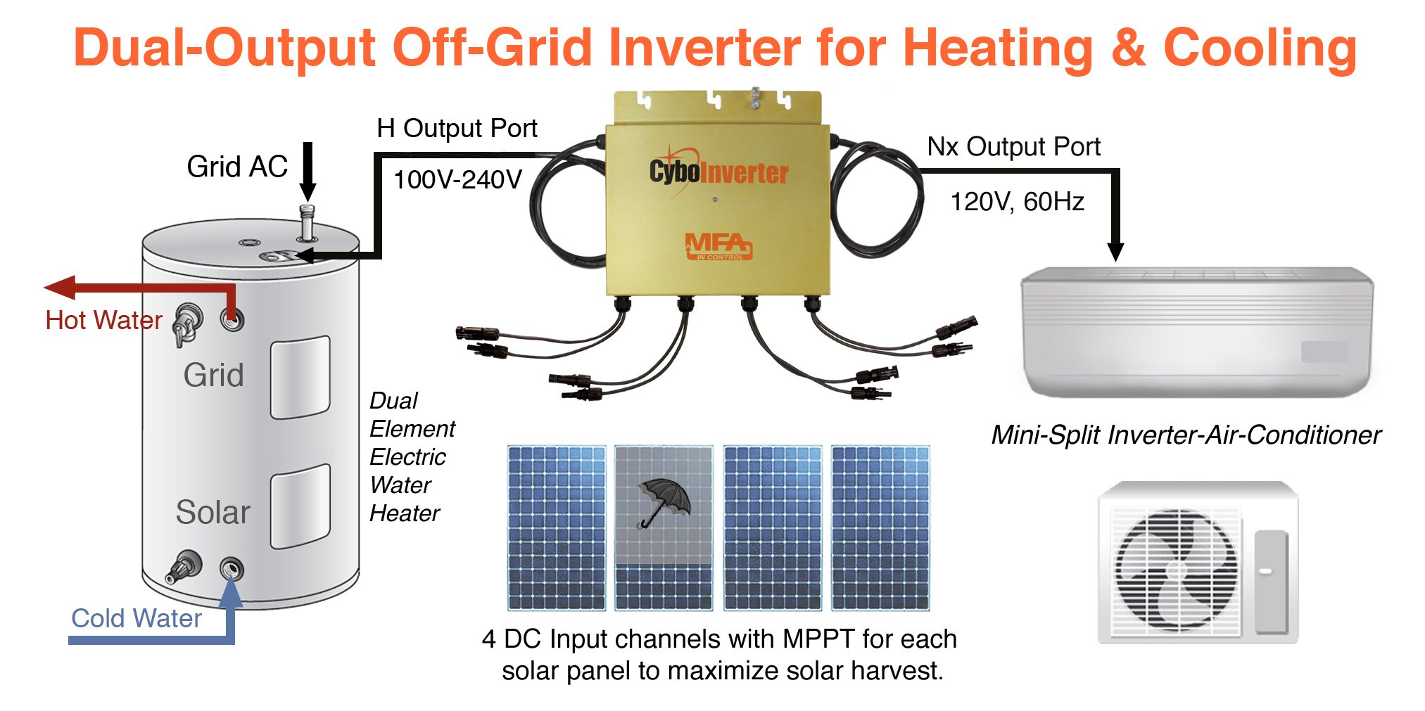 As stated on the Solar Power World Magazine website for 2022 Top Inverters Products, “This inverter can power electric water heaters in mode-1 or AC loads in mode-2. PV water heating systems are simple and cost-effective. The inverter can also run lights, fans, TVs and mini-splits. It is ideal for cottage homes. CyboInverters have 4-input channels with panel-level MPPT and can support 450-W panels.”
