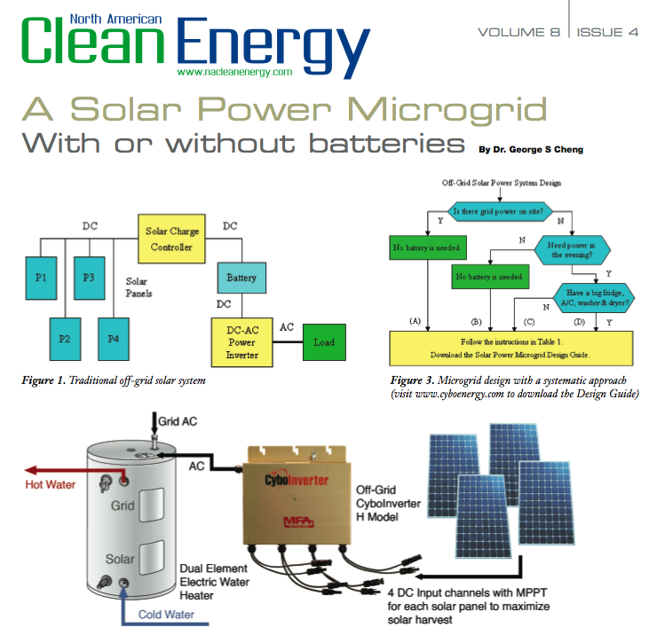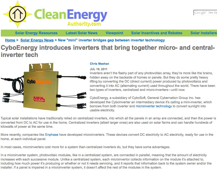 "Two years ago I introduced you to the CyboInverter, a "mini-inverter" that combines the best features of string inverters and microinverters. (For more comparisons between string inverters and microinverters, click here.) In that article I wondered why they didn't make a model that could work both on and off the grid. I guess they took my comment seriously because a few weeks ago, Dr. George S. Cheng, chief technical officer of CyboEnergy, contacted me and told me about their newest CyboInverter: a hybrid On-Off Grid inverter. Dr. Cheng believes that CyboEnergy's multimode mini-inverter is the only one of its kind in the industry, so let's take a look at what it does." |