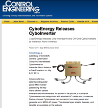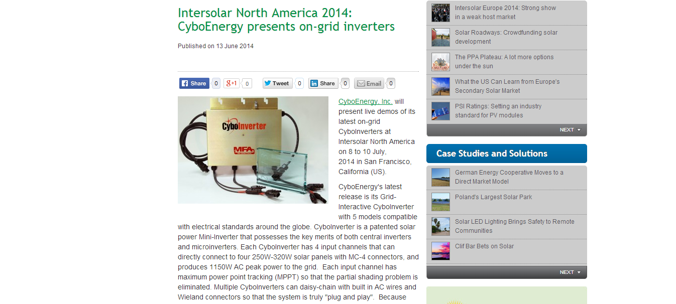 CyboEnergy, Inc. will present live demos of its latest on-grid CyboInverters at Intersolar North America on 8 to 10 July, 2014 in San Francisco, California (US).