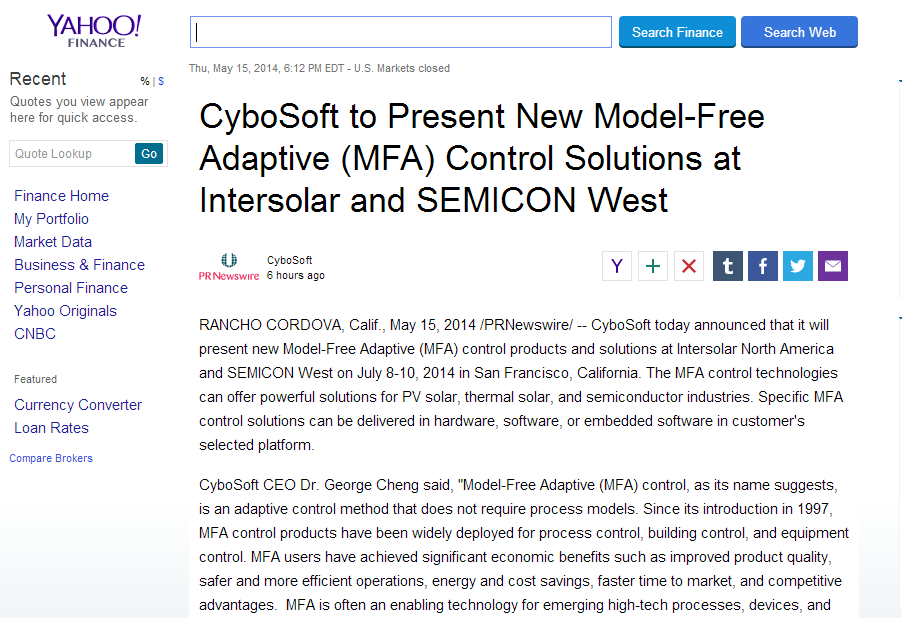 CyboSoft today announced that it will present new Model-Free Adaptive (MFA) control products and solutions at Intersolar North America and SEMICON West on July 8-10, 2014 in San Francisco, California.