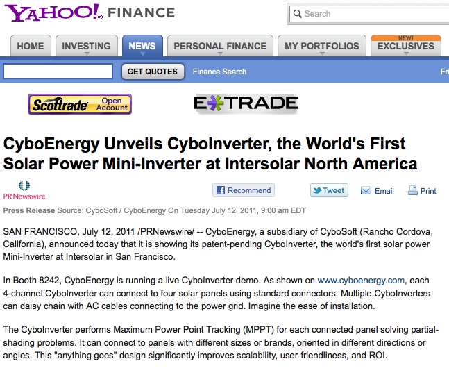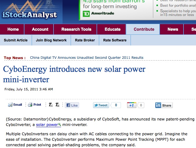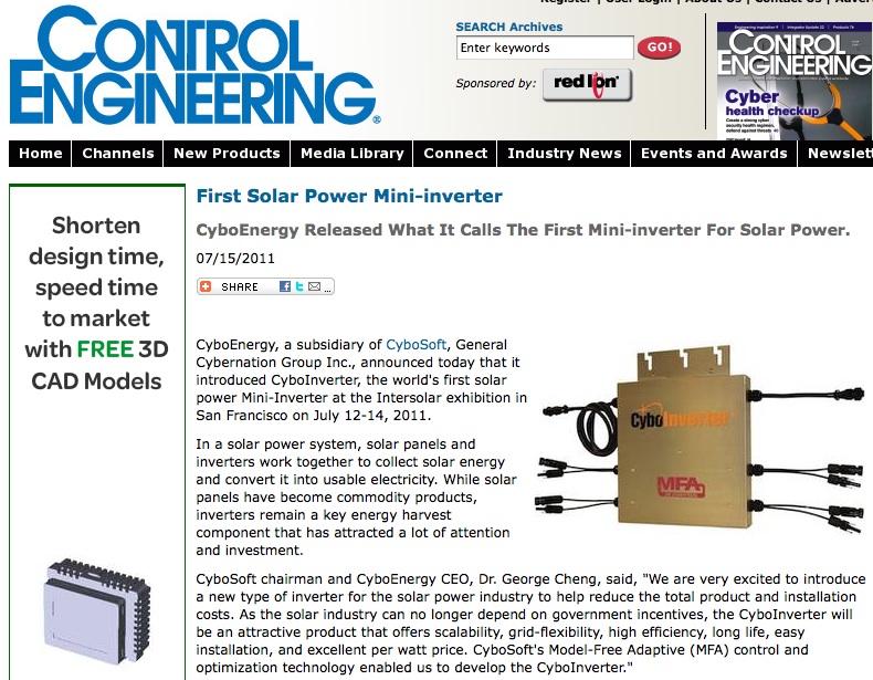 CyboEnergy, a subsidiary of CyboSoft, General Cybernation Group Inc., announced today that it introduced CyboInverter, the world's first solar power Mini-Inverter at the Intersolar exhibition in San Francisco on July 12-14, 2011. |