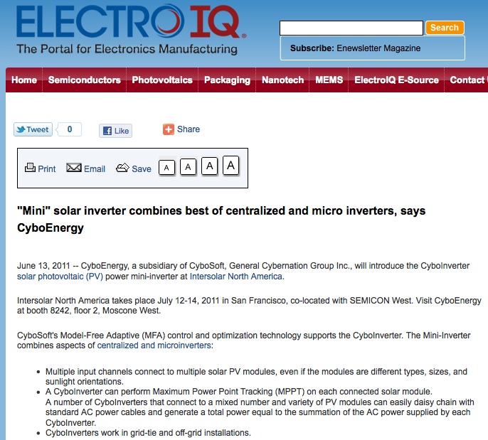 CyboEnergy, a subsidiary of CyboSoft, General Cybernation Group Inc., (Rancho Cordova, California), has introduced its CyboInverter, it's first solar power Mini-Inverter at Intersolar North America in San Francisco on July 12-14, 2011. |