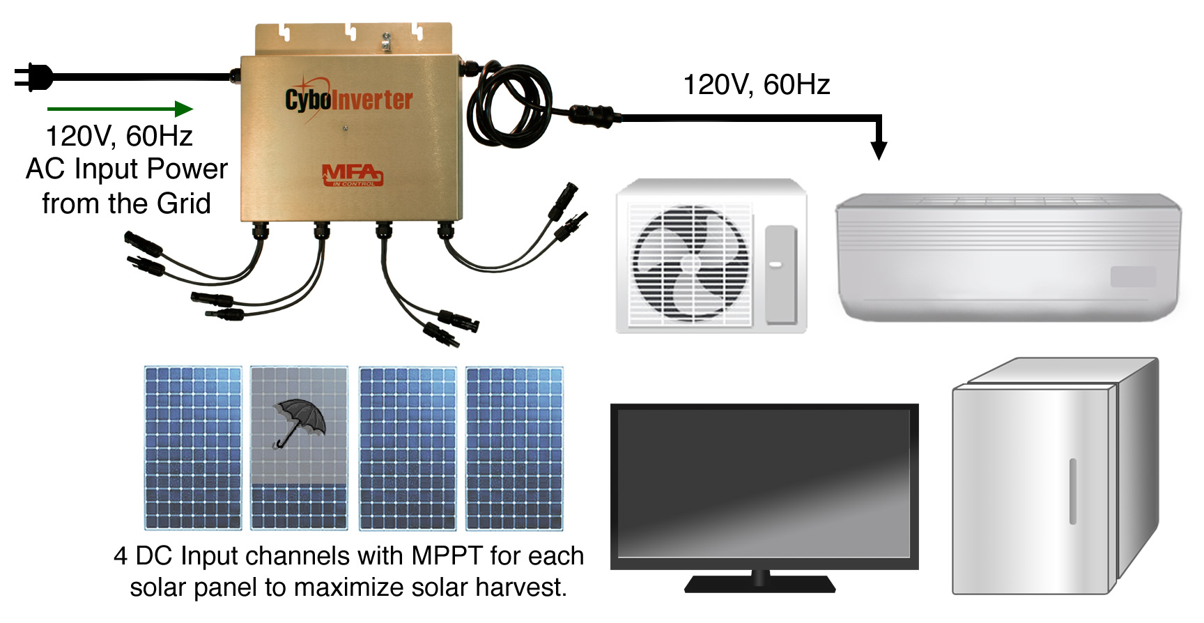 The AC assisted off-grid CyboInverters include the following features and benefits: (1) can run AC loads with solar power only, grid power only, or combined power; (2) require no batteries; (3) have panel level MPPT to maximize solar production; (4) can start heavy loads with assisted AC power and run the loads with only solar power; (5) avoid all the headaches of an on-grid solar system, and (6) are easy to install with great ROI.