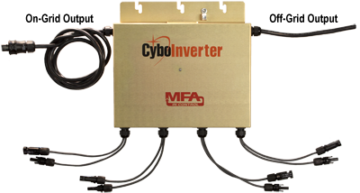 Each CyboInverter (CIM-1200A/N) can connect to four solar or battery DC sources and produce 1250W, 240V, 60Hz AC to the grid when grid is on, or 120V AC to an off-grid circuit to run AC loads.