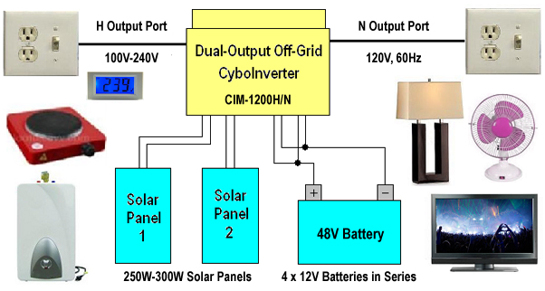 Each CyboInverter (CIM-1200H/N) can connect to four solar panels or a 48V battery, and generate up to 1250W AC to power heating elements via H port or produce 120V AC to run AC loads via N port. |