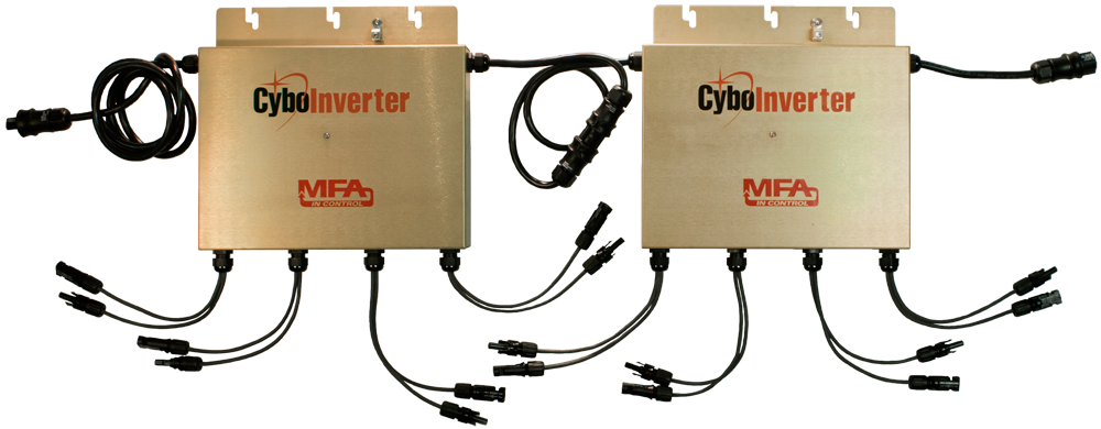 Each CyboInverter (Mini-1000A) can connect to four solar panels or other DC sources and produce 1250W, 240V, 60Hz AC power to the grid. Multiple CyboInverters can daisy chain. Installation is super easy.