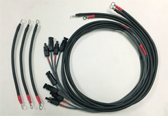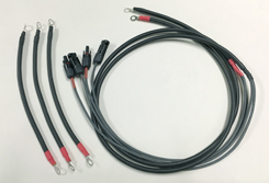 (1) 3 battery wires with ring terminals to connect 4 x 12V batteries in series, (2) Four pairs of 6 feet battery cables with MC-4 Connectors and ring terminals to connect the 48V battery to 4 CyboInverter channels. |