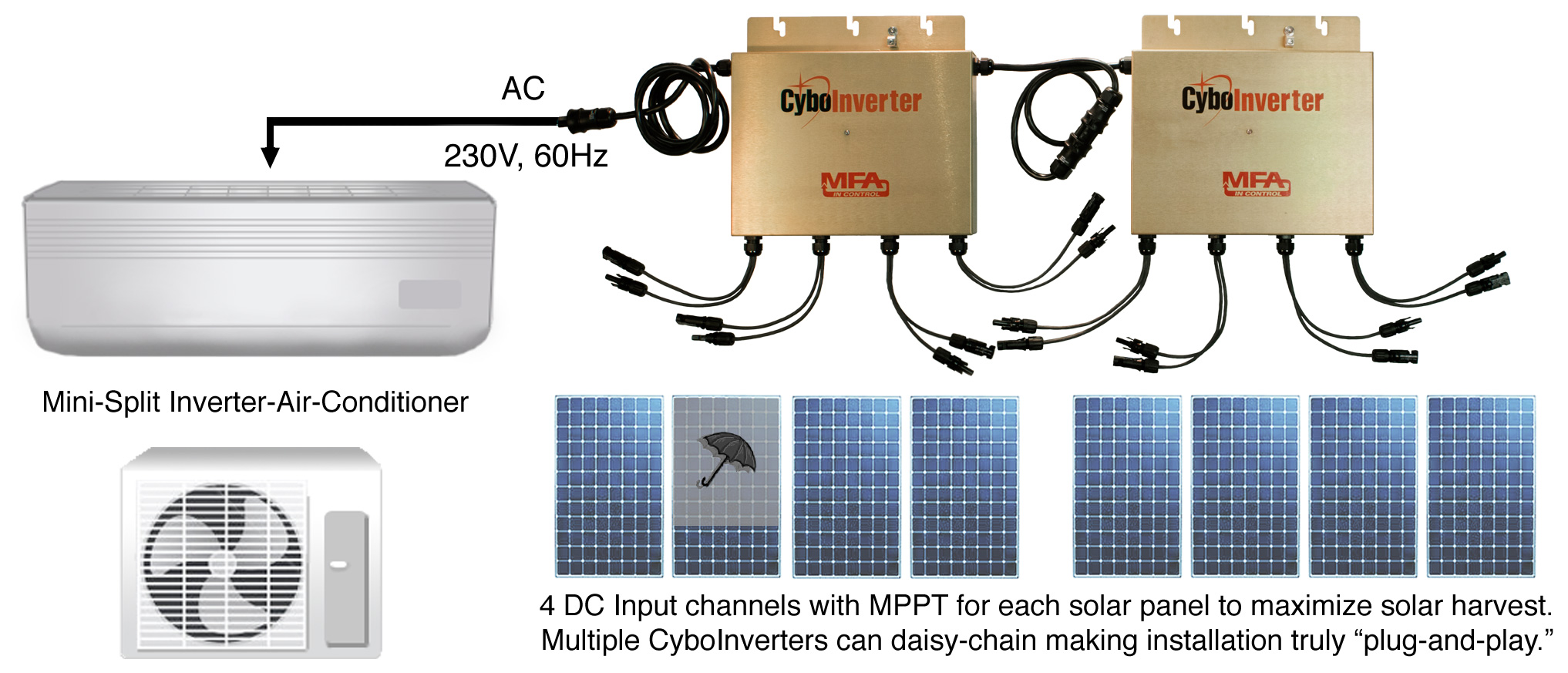 The graphic above shows a 4-channel 1.2KW off-grid CyboInverter that directly connects to four 250W to 330W solar panels with MC-4 connectors. It can run a 9000 to 12000 Btu IAC. The graphic below shows an off-grid CyboInverter Twin-Pack that connects to eight solar panels and can run an 18000 to 24000 Btu IAC or multiple smaller IACs. Solar panels and CyboInverters can be installed on the roof with "plug-and-play" installation. The AC output wire runs down to connect to the IAC. Since the system is so simple and easy to install, the total system cost is affordable, especially as the solar panel price has dropped substantially. Most off-grid inverters on the market require batteries to operate. This battery-less solar air conditioning system is unique, cost effective, and can work in high temperature and high humidity areas.