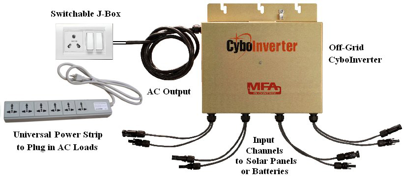 Microgrids are emerging as a credible threat to the dominance of the traditional utility monopoly. Off-grid power systems were once used as a backup for blackouts, are now gaining rapid adoption from homeowners to large-operation customers for daily use. Similar to what mobile phones have done to wired phones, microgrids can also leap over traditional power grids and provide power to rural parts of the world where a billion people are living without electricity. As shown in the picture, an off-grid CyboInverter has 4 input channels to connect to 4 solar panels or battery sets and generates up to 1250W AC power. An off-grid electrical circuit can be built with the CyboInverter, a switchable AC junction box, and a power strip. This is actually a simple and useful microgrid.
