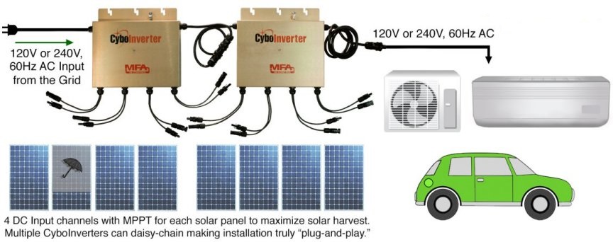 - 1KW to 5KW off-grid solar systems for areas where on-grid solar is no longer welcomed due to the Duck Curve problem or due to the lack of Net-Metering program. The AC assisted off-grid CyboInverters can run electric water heaters, IAC, central A/C, pool pumps, EV chargers, and other heavy loads.