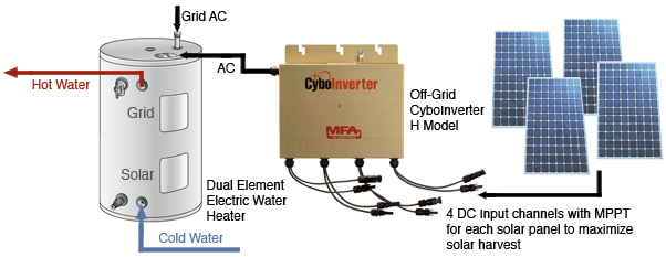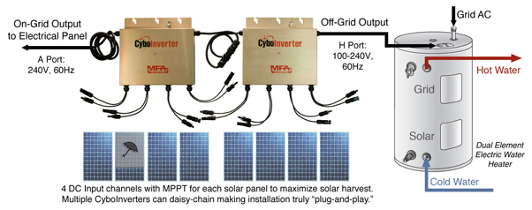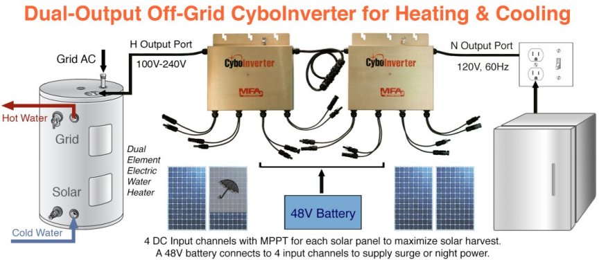 Instead of using batteries, why not use solar PV water heating to store energy in the form of hot water? The Off-Grid CyboInverter H model and its twin pack enable off-grid PV water heating that has a rapid growing demand. Packaged PV water heating systems with OG-300 certifications are available through CyboEnergy's strategic partners.