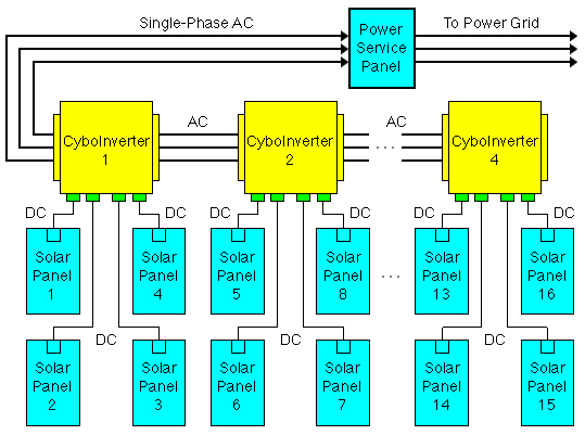 The drawing above demonstrates the essence of the scalability of this invention. In this case example, the smart and scalable power inverters are 4-channel CyboInverters in solar power applications. One can build a small-scale or a very large-scale solar power system with various numbers and sizes of smart and scalable power inverters. Regardless of the number and types of DC sources that each power inverter can handle, the smart power inverters in the same family can daisy chain or connect in parallel producing AC power that is the summation of the AC power supplied by each smart power inverter. This "anything goes" design significantly improves the scalability, flexibility, user-friendliness, and return-on-investment (ROI) of renewable power generation systems including photovoltaic solar power systems. In addition, an existing system can be easily expanded by installing more solar panels and smart power inverters. This makes solar power systems attractive to both homeowners and businesses where only limited budgets are available and continued investments can be made to expand the system over time. This invention can have strategic importance to the renewable energy industry and society.
