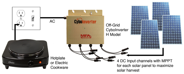 As shown in the following drawing, an off-grid CyboInverter has 4 input channels, where Channel 1 and 2 can connect to 2 solar panels and Channel 3 and 4 can connect to a 36V battery set. Its AC output can power lights, fans, TV, PC, battery chargers, and refrigerators. The CyboCharger takes power from the same off-grid AC circuit as a load and charges the battery during the day. When there is sufficient sunlight, CyboInverter will pull power from the solar panels and leave the batteries idle, extending battery life.