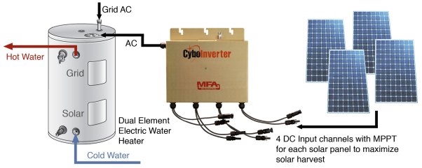 Instead of using batteries, why not use solar PV water heating to save energy in the form of hot water? The following figure shows an off-grid PV water heating system, where a CyboInverter H model is connected to 4 solar panels and delivers solar energy to the lower heating element of the water heater. The temperature setpoint for the lower element can be purposely set much higher than the upper element. This way, the upper element that consumes grid power does not turn on unless a lot of hot water is used within a short period of time. Compared with thermal solar, PV water heating is simple, clean, safe, cost-effective, and has no maintenance requirements. Packaged PV water heating systems with OG-300 certifications are available through CyboEnergy’s strategic partners.