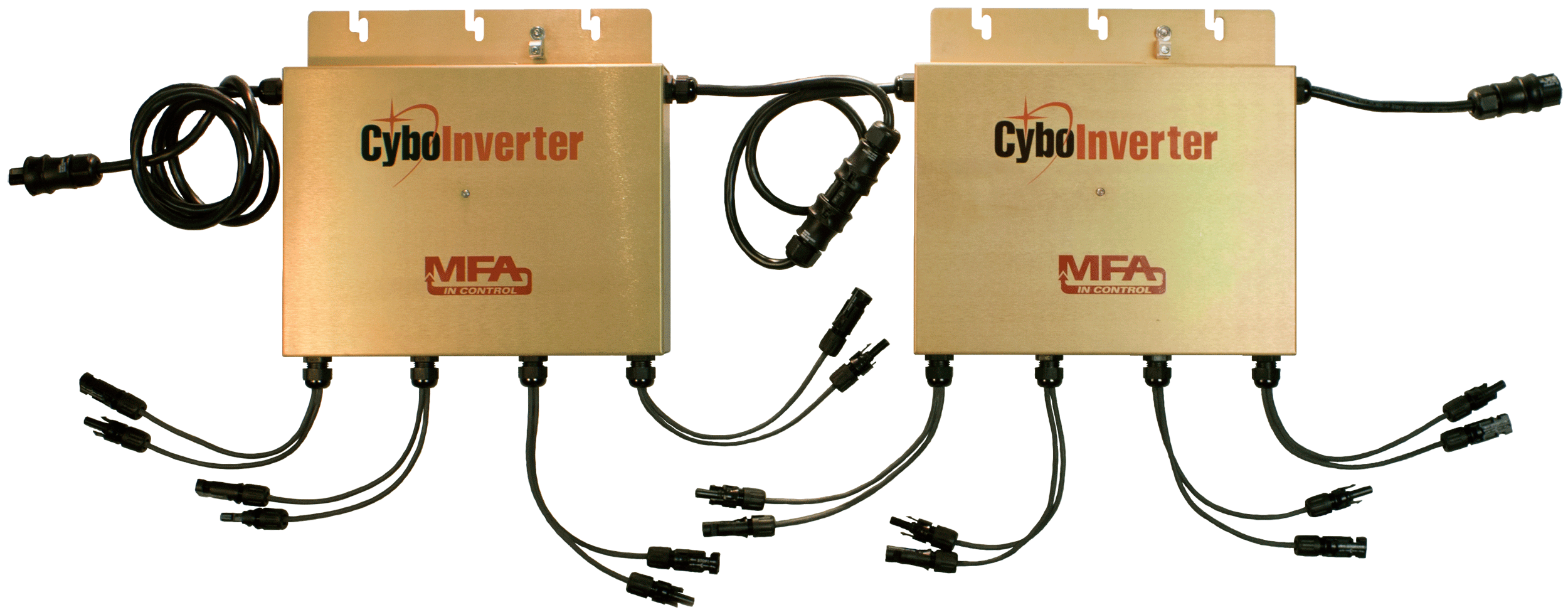 CyboInverter is a patent-pending solar power Mini-Inverter possessing the key merits of both central inverters and microinverters. As shown in the picture, a number of CyboInverters can daisy-chain with attached AC cables and connectors. Each 4-channel CyboInverter can connect to four solar panels and generate up to 960W AC power. The detailed spec sheets, features, and benefits are available on CyboEnergy’s website. (www.cyboenergy.com)