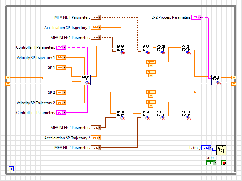 As an example, the picture on the left below shows a Neck joint with Pitch and Yaw motions. Since these two motions are coupled, a 2-input-2-output (2x2) dynamical model (Neck 2x2 P) can be selected by the user. A 2x2 MFA Feedforward controller (2x2 MFA FF) can be chosen to control this 2x2 process. The LabVIEW program that implements this 2x2 control system is shown on the right.