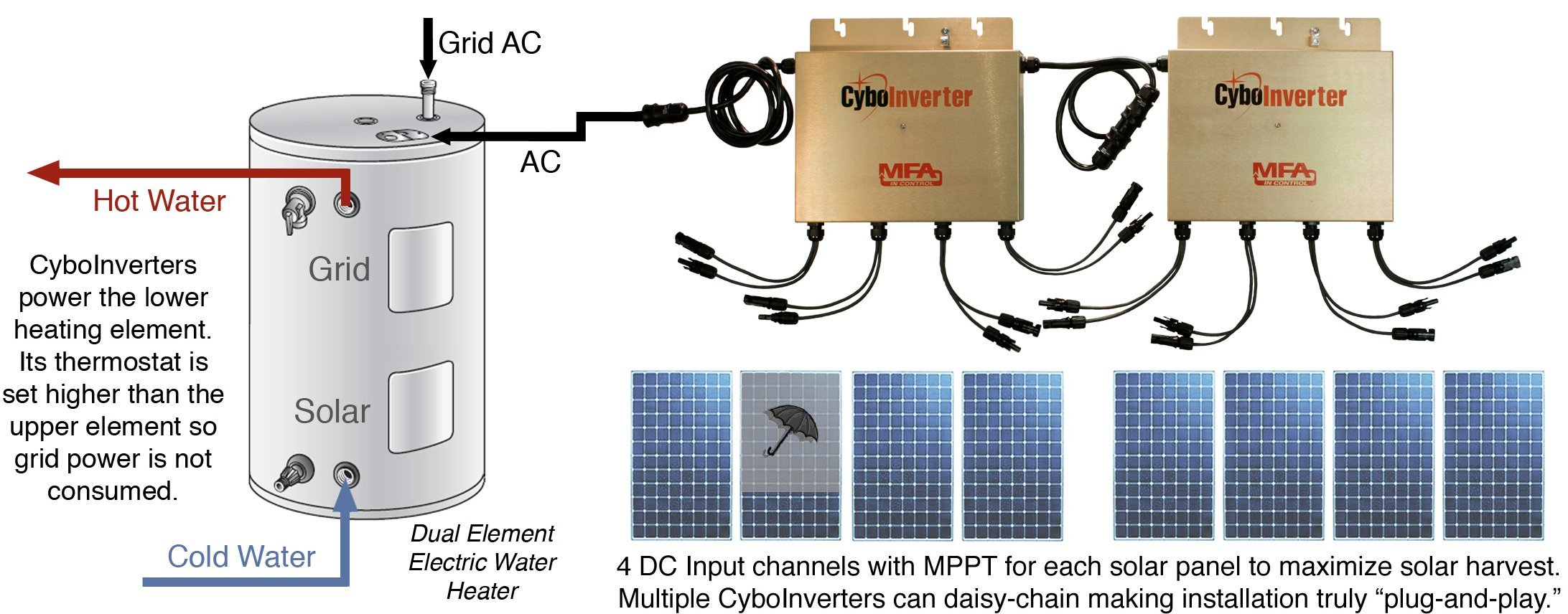 As stated on the Solar Power World Magazine website for 2022 Top Inverters Products, “This inverter can power electric water heaters in mode-1 or AC loads in mode-2. PV water heating systems are simple and cost-effective. The inverter can also run lights, fans, TVs and mini-splits. It is ideal for cottage homes. CyboInverters have 4-input channels with panel-level MPPT and can support 450-W panels.”